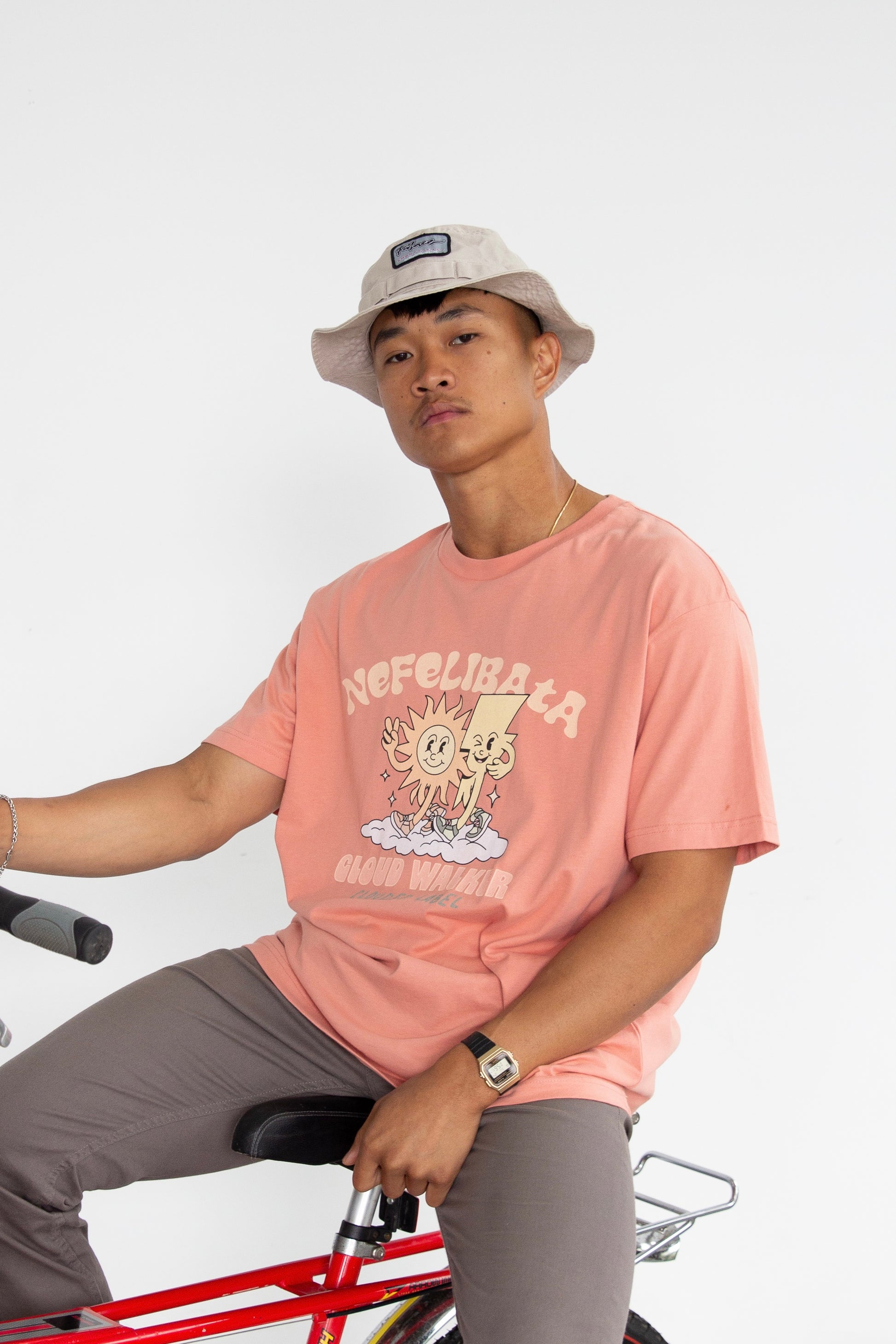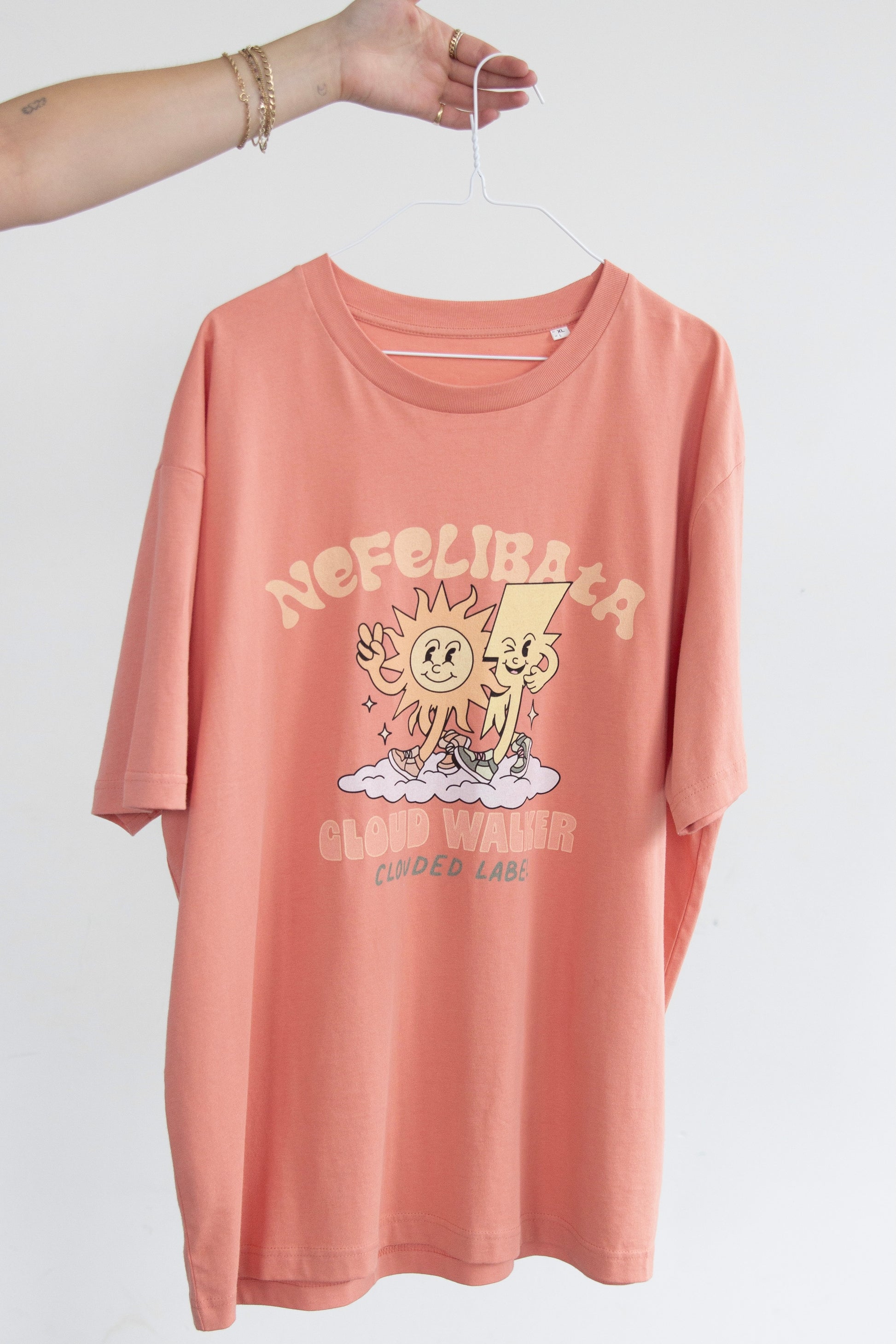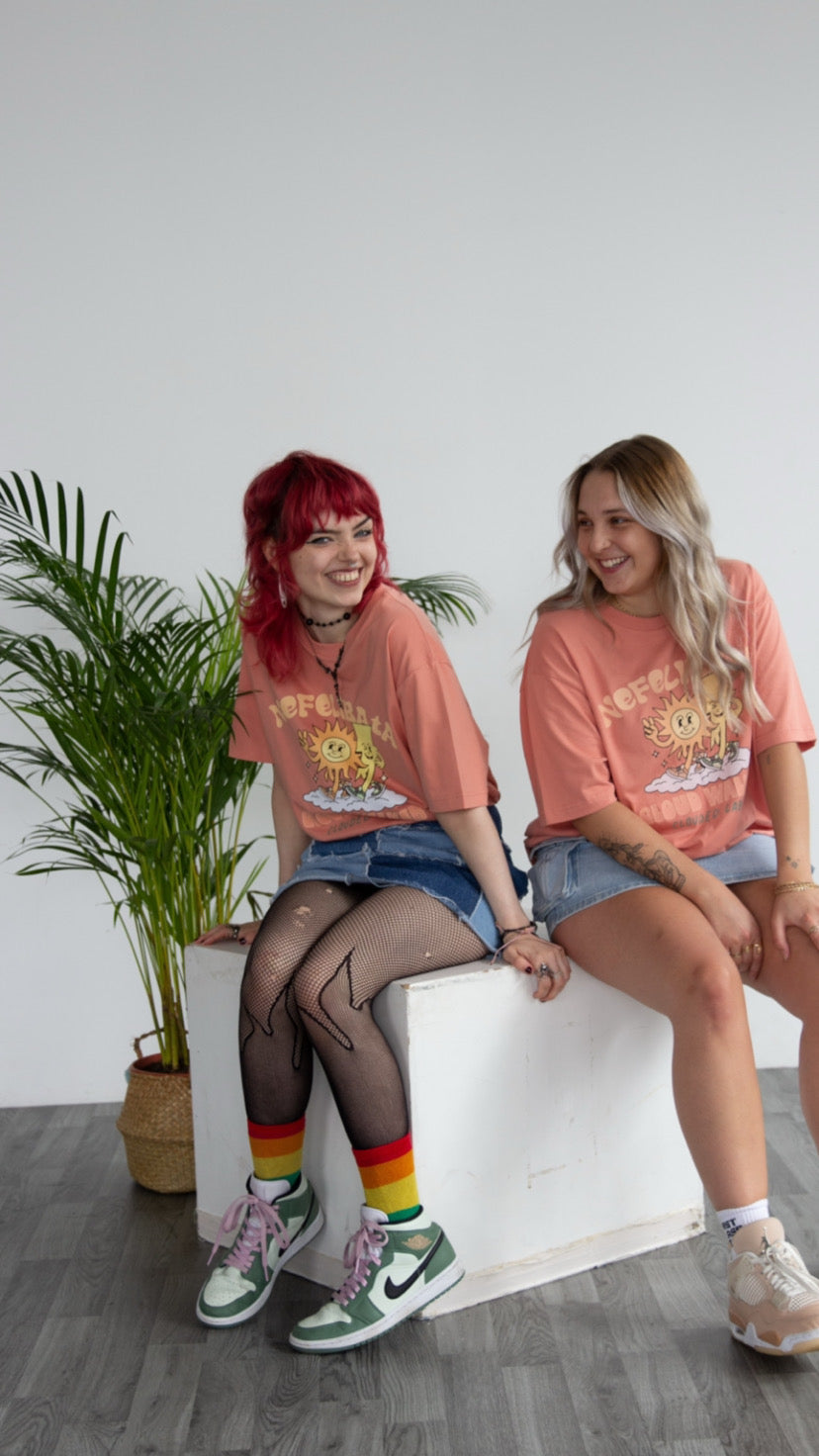 The design features a lightning bolt (reference to Storm from X-Men!!) and a sun, walking together on the clouds with a peace sign! The tee is a boxy oversized fit in a peachy clay colour with a apricot/yellow design palette. The perfect tee for summer vibes!