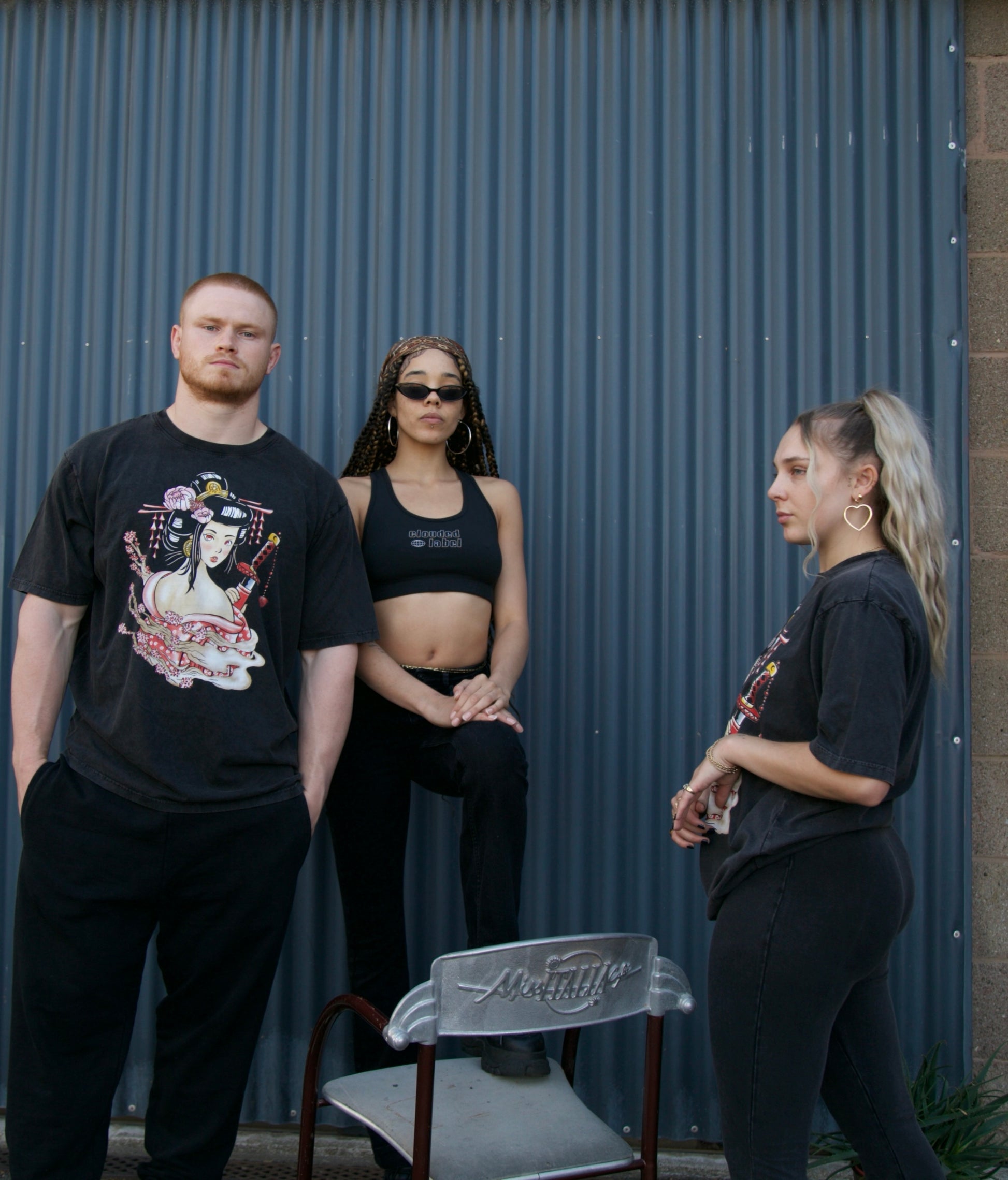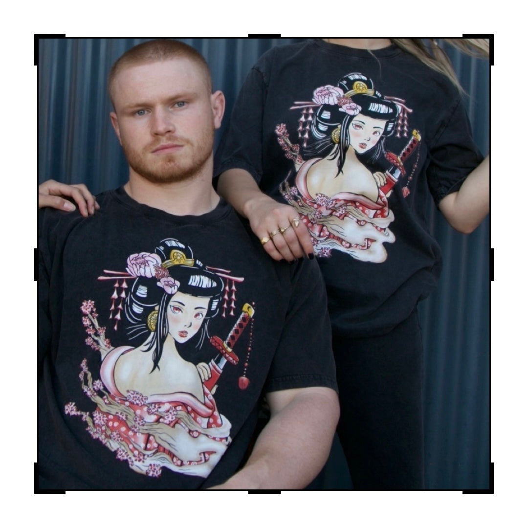 The Geisha is a symbol of grace and beauty in Japanese Culture. They are respected within Japan for being highly skilled entertainers. The design features a traditional Geisha in a kimono and kanzashi (hair ornament), combined with ideas of a Samurai. She holds a Katana, similar to the Katana tee, to complete a feminine and masculine design.