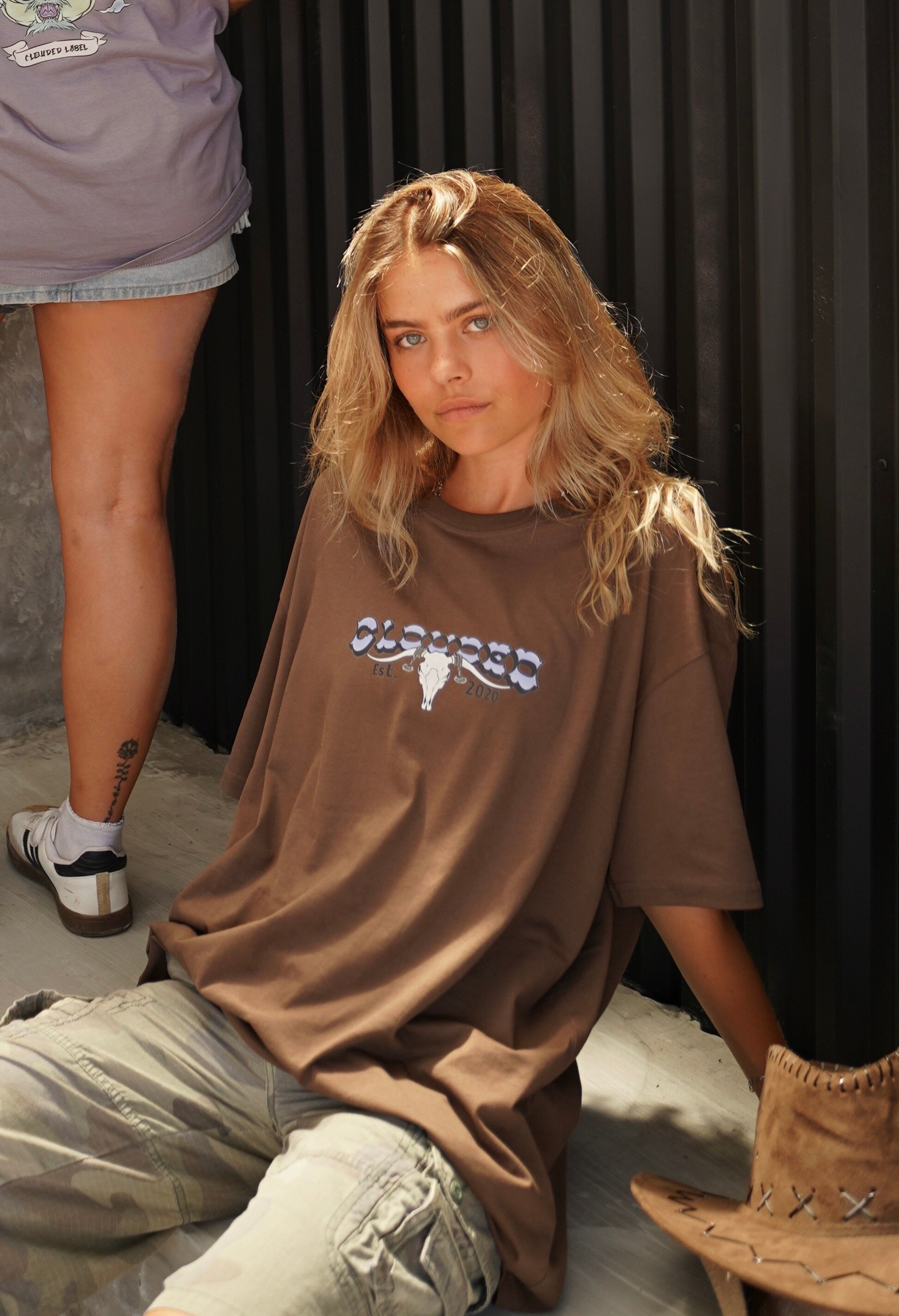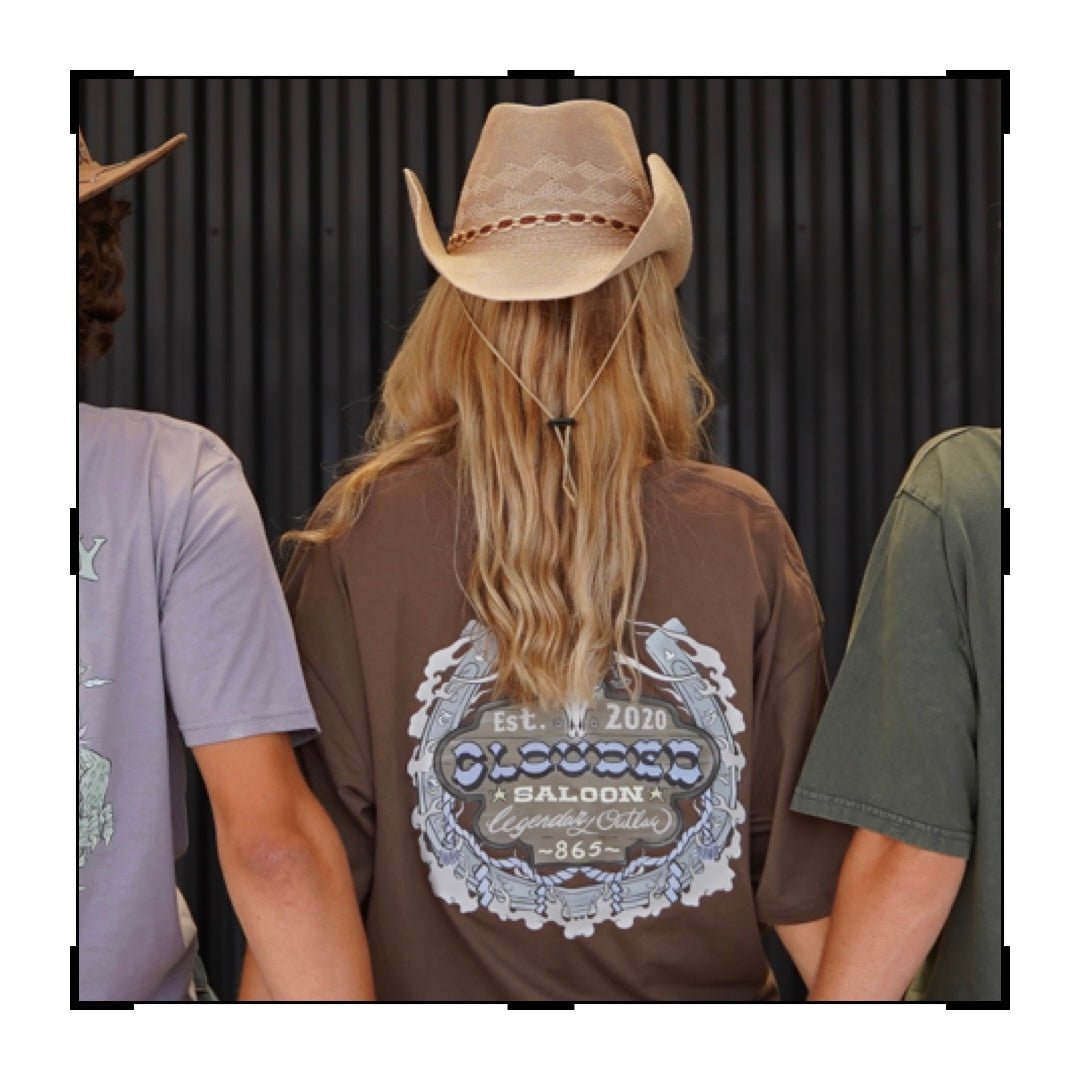 Think saloon, western town, desert vibes with the OUTLAW tee. On a tobacco brown tee featuring a grey, brown and lilac colour way.