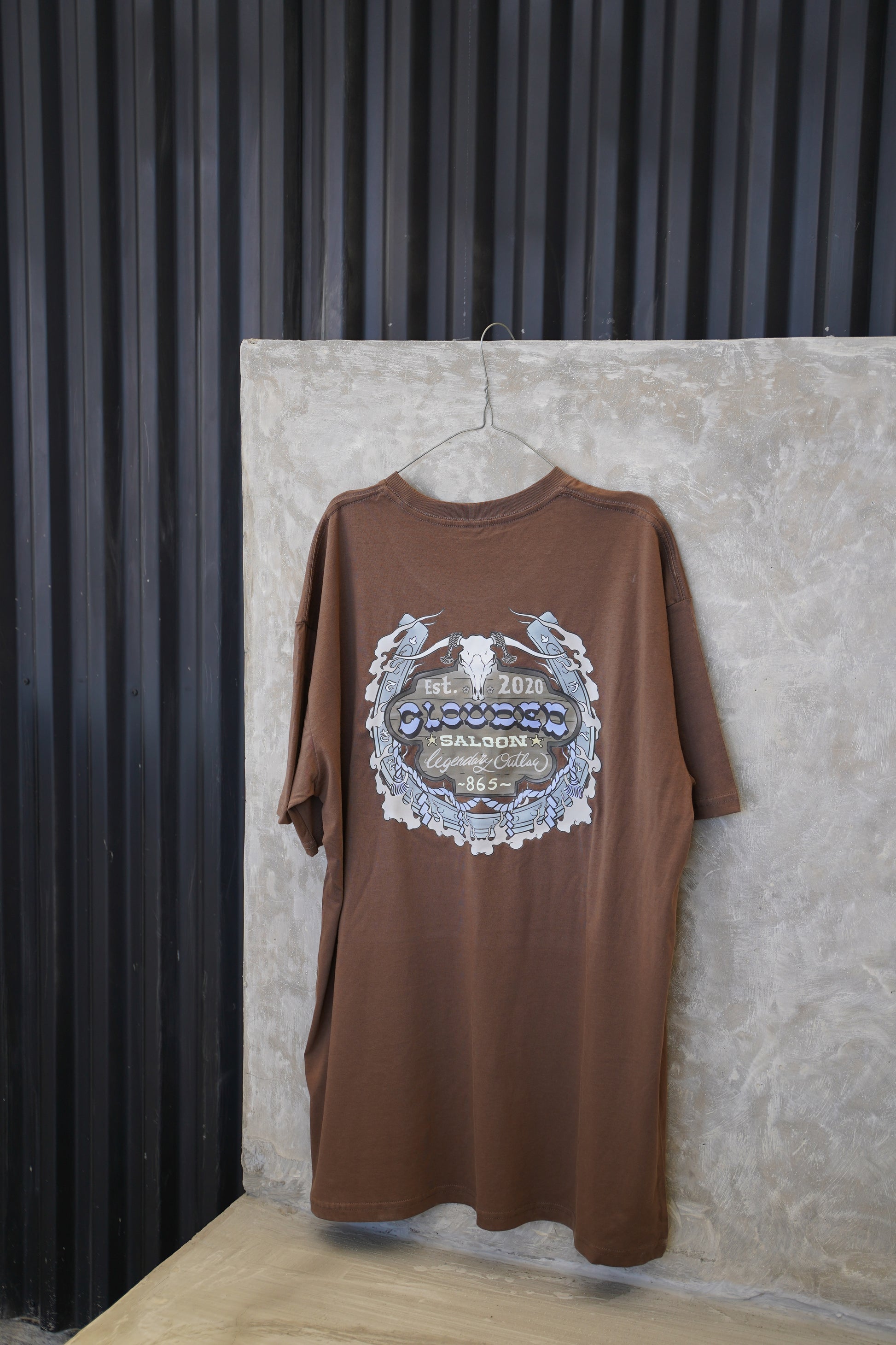 The design is a saloon sign, showing our brand name and establishment year, with a skull, horseshoe and clouds, of course.