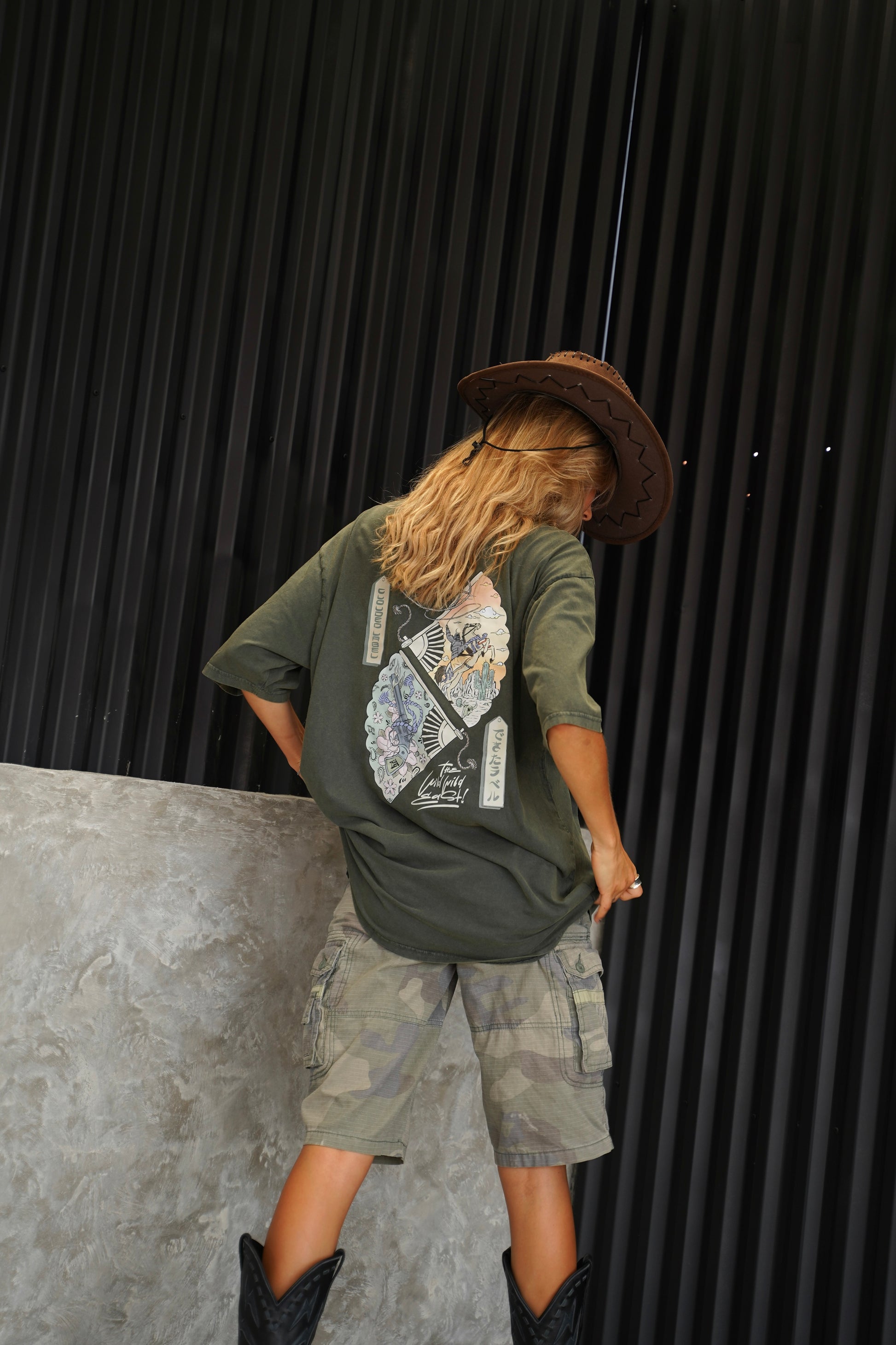 Another perfect stone wash to add to the collection. This time on a forest green tee - perfect for this collection! The colour way on the design features stones, greys, sunset orange, lilac and sage.