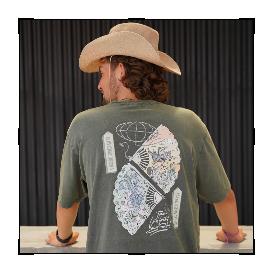 Spirit: stallion of the cimarron was my favourite movie ever as a kid!! So had to design the horse in his colourings, with a samurai lassoing our signature clouded globe out of rope - obviously had to countrify the globe! The desert sunset scene is based inside a Japanese fan, with the other fan featuring a cowboy's pistol wrapped in rope and flowers, with a bandana print as the background of the fan.